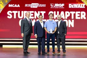 Twenty-five students were recognized with JRGF scholarships totaling $110,000 at MCAA26. Indiana State University emerged as the victors for the Student Chapter Competition and returned to campus with a $10,000 prize, sponsored by DEWALT, following their main stage Final Four presentation in Phoenix. The MVP – Most Valuable Presenter was awarded to Braidyn Hudson from Indiana State University.