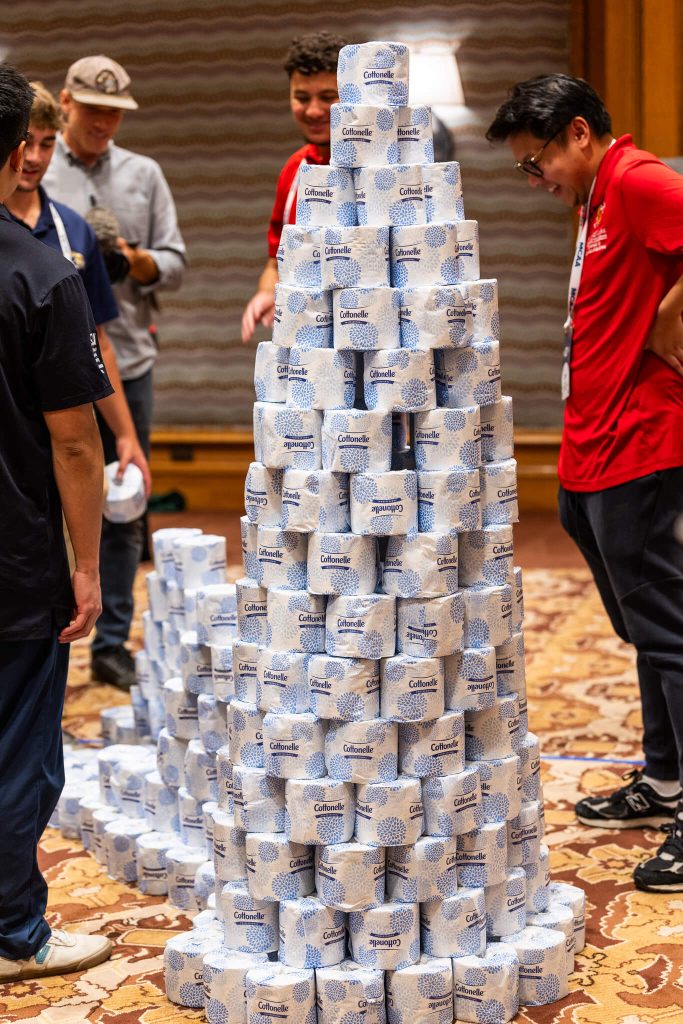 Following the challenge, three judges circled the rooms to time stamp the scoresheets (schedule score) and then give points for creativity. The students then carefully packaged the TP back up and paraded through the hotel with the boxes to the loading dock.