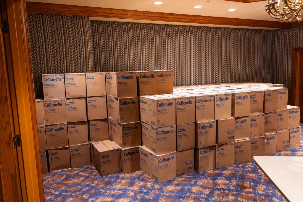 The first decision was whether their team wanted to sub out opening their boxes to a member of the Career Development Committee with the proper tools and PPE, or if they wanted to self-perform with safety scissors. Ripped boxes incurred a hefty fictional fine since they were needed to transport the 160 cases of TP to the shelter. Ripped outer rolls were also fined since the TP would be unable to be donated to the shelter and would need to be disposed of.