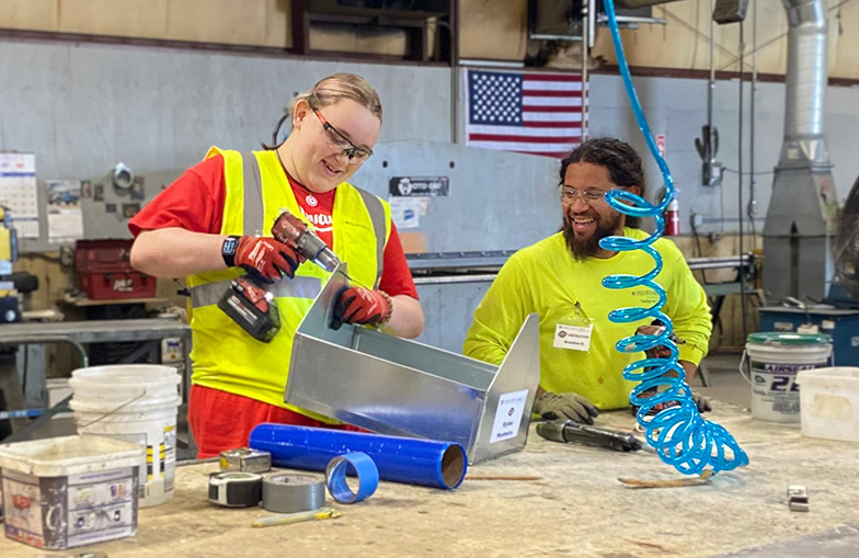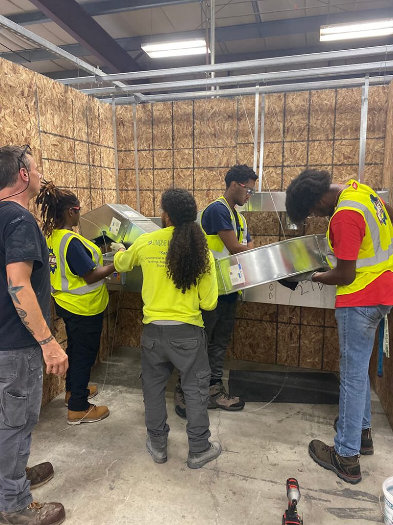 Representatives from Local 17 Sheet Metal Workers and Local 51 Plumbing & Pipefitters visited the camp to speak about apprentice programs, how to apply, labor rates, and what to expect if they join the union. Homans Associates and Duro-Dyne also provided a demonstration that tied into the duct box project and the cable hangers for installation.