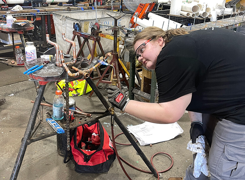 While working in the fabrication shop, students had the opportunity for discussions with UMW’s craft professionals and heard stories about working in the field. They also spoke with apprentices and journeymen about the stages of career progression. The students and mentors developed a relaxed and fun learning environment. Additionally, the students worked on a plumbing project at their sister company, Arden Engineering Constructors (AEC), located just next door. They worked with copper pipe soldering to create the “Pipe Man.”