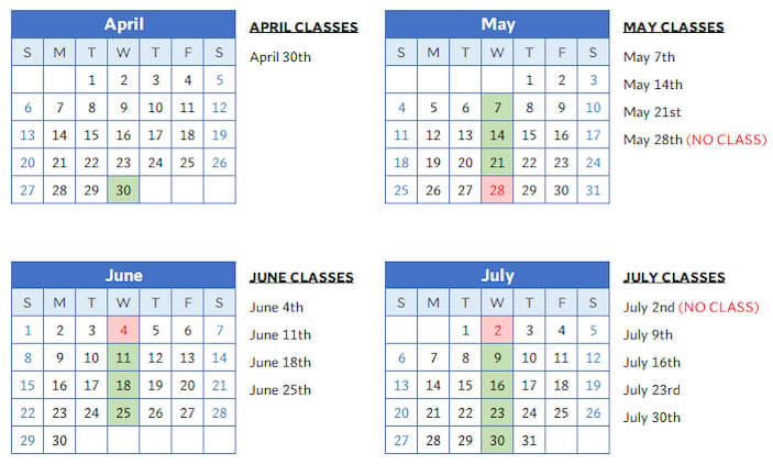 - There are no classes the weeks of May 26th or June 30th, due to holidays.