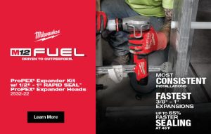 The M12 FUEL™ ProPEX® Expander unlocks a breakthrough in productivity for plumbing installers, delivering the fastest 3/8”-1” expansions. Featuring an auto-rotating head, the expander provides you with uniform expansions for the most consistent installations. In combination with the ProPEX® Expander Heads with RAPID SEAL™, installers will experience up to 65% faster sealing of connections as temperatures decrease, reducing the time before pressure testing.
