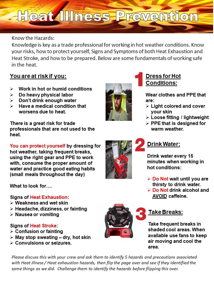 MILWAUKEE TOOL has started a monthly safety emphasis program. Below you will find information for July’s Heat Illness Prevention campaign. The information comes from some of the industry’s most credible sources, including the Center for Construction Research and Training (CPWR), the National Institute for Occupational Safety and Health (NIOSH), and the Occupational Safety and Health Administration (OSHA).