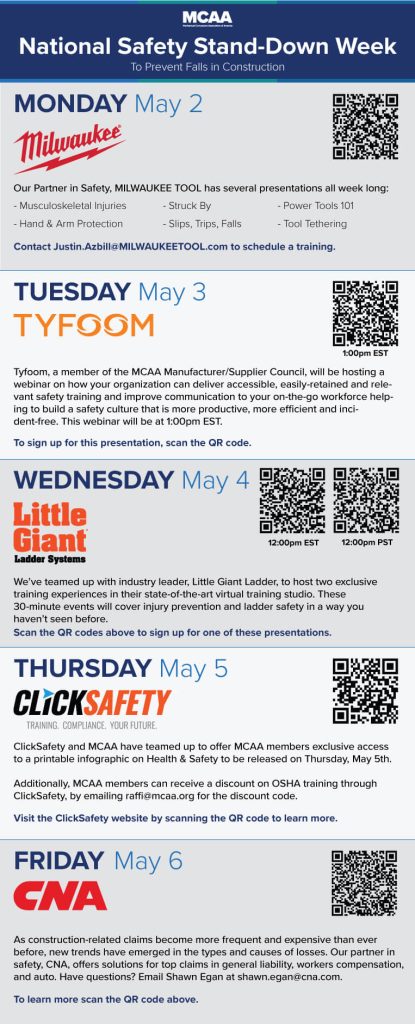 We are two weeks away from National Safety Stand-Down to Prevent Falls in Construction. Register now for MCAA’s daily offerings.