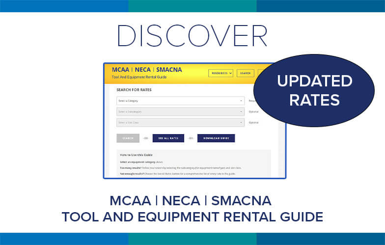 Construction tools and equipment are an essential part of any contractor’s business and can represent a significant investment. Companies need the most updated costs to inform internal estimating, project proposals for new and potential customers, and cost accounting efforts surrounding contractor-owned equipment. The newly updated MCAA | NECA | SMACNA Tool and Equipment Rental Guide provides a robust guide to equipment recovery costs for mechanical, electrical, line and other construction contractors. It’s just one of MCAA’s educational resources that are free to MCAA members as a benefit of membership.