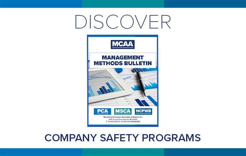 Worker safety and health is a top priority for mechanical contractors. MCAA’s Company Safety Programs reviews ten basic components that should be covered in every company safety program, regardless of company size, giving contractors food for thought as they review their own company’s program. It’s just one of MCAA’s educational resources that are free to MCAA members as a benefit of membership.