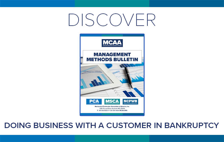 When a customer files bankruptcy, mechanical contractors face legal and other pitfalls that may affect their business relationship with that customer. MCAA’s Doing Business with a Customer in Bankruptcy reviews each of these to help contractors preserve relationships and protect their  bottom line. It’s just one of MCAA’s educational resources that are free to MCAA members as a benefit of membership.