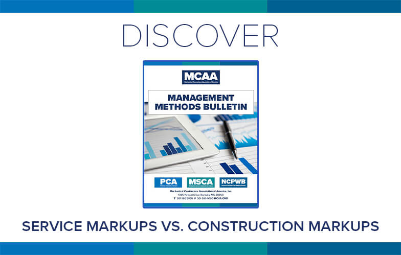 Markups provide funds to cover overhead costs, a fair and reasonable profit, and some cushion in case estimated costs are exceeded. MCAA’s Service Markups vs. Construction Markups discusses the elements of a job estimate that may be considered for markups. It’s just one of MCAA’s educational resources that are free to MCAA members as a benefit of membership.