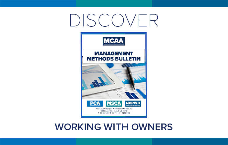 Mechanical contractors that work cooperatively with owners, design teams, suppliers and subcontractors tend to have more successful and cost advantageous projects. MCAA’s Working with Owners provides information to assist you in doing just that by developing guidelines for an effective and cooperative work environment, establishing responsibilities up front, and scheduling regular meetings to discuss progress. It’s just one of MCAA’s educational resources that are free to MCAA members as a benefit of membership.