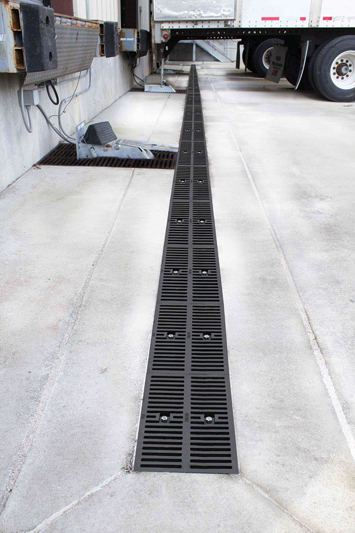 Polypropylene Zip Trench with an extra-heavy-duty frame and grate is appropriate for busy loading dock traffic.