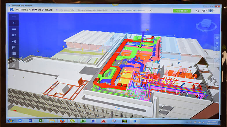 project design impacts on the existing structure. Once the laser scan of point cloud data was converted, the team used SysQue to inject greater intelligence into the 3D BIM model. With SysQue, Arden Engineering Constructors was able to include real-world content in the design, including detailing, fabrication, manufacturing, and installation specifications. The model was viewed in Revit, then exported to Autodesk’s Navisworks software, which created a snapshot of the project including models, the scene’s environment, viewpoints and redlines, and measurements for coordination among trades.