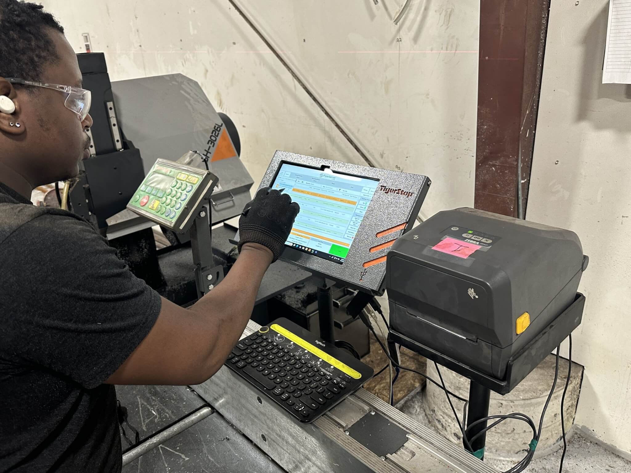 - A semi-automatic bandsaw for grooved or threaded materials, fed by a TigerStop running Lyte software