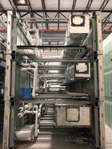 Using pressing tools and NIBCO fittings, Brandt made most of the joints inside the racks, which range in size from 20’ to 30’ long so they could be transported. Once the racks were moved to the project site by flatbed trucks, each rack had to be connected, which was done via pressing. More than half of the NIBCO fittings are pressed fittings used on the prefab systems.