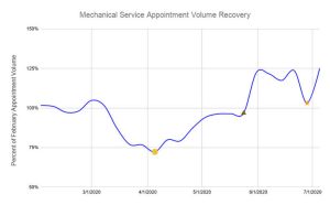In the second half of March and into the first week of April, mechanical service, repair, and maintenance appointment volume dropped by 28 percent from February levels. This low point is marked with a yellow circle in Figure 1. From the first week of April until the end of May, the appointment volume recovered to about 120–125 percent of February levels with a jump after the Memorial Day holiday week (marked by a brown triangle in Figure 1). Appointment volume has held steady since then, with the exception of a small dip during the July Fourth holiday week (marked with a gold star in Figure 1).