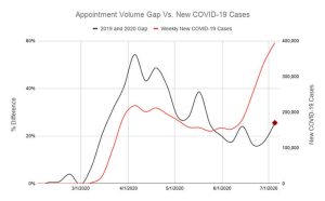 When we graph the gap between expected and actual appointment volume as a line in Figure 3 (instead of an area, as in Figure 2), it is easy to see some recovery, as the gap narrowed through April and May. However, as the number count of newly reported COVID-19 cases started to increase again in June (red line in Figure 3), the recovery stalled, and the gap between the expected and actual appointment volume grew after the July Fourth holiday to 26 percent.