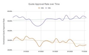 So, what do the data suggest you can do to speed up your company’s recovery? For that, we looked at quote approval rates for over 120,000 service, maintenance, and repair quotes processed through ServiceTrade for February through June of 2020. When we measure the number of ServiceTrade quotes approved in a week and divided by the number of quotes submitted to customers in that same week, we can chart a normalized quote approval rate over time.