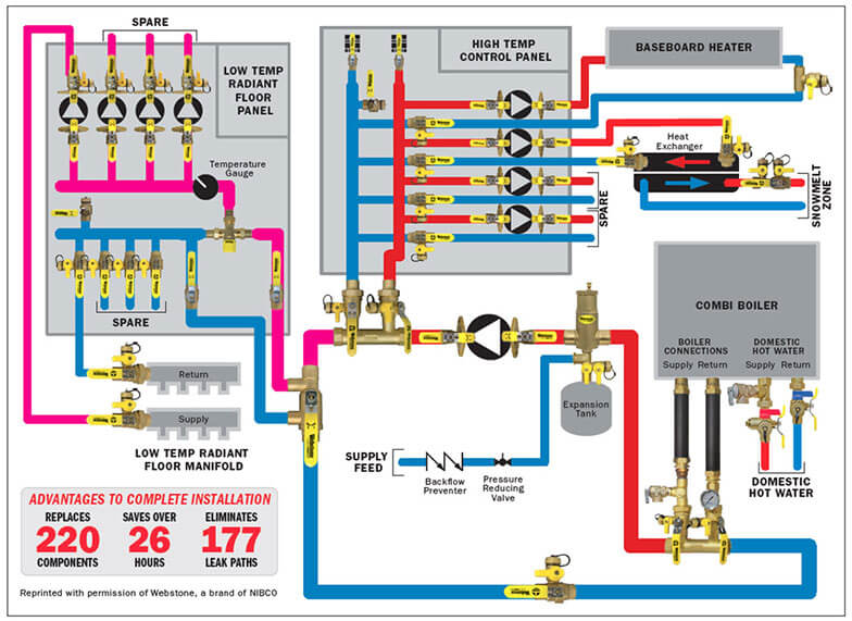 Hydronic systems have changed over the years. Many innovative products, such as NIBCO’s Webstone® valves, save labor, space, and leak paths. When designing your next hydronic system, consider the newest valve innovations available. In a complete installation, valve selection is essential to having a modern and efficient hydronic system. With the right products, you can expect to replace 220 components, save over 26 hours of labor, and eliminate 177 leak paths.