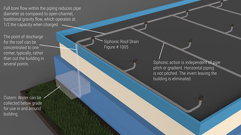 Because the piping primes and operates when 100-percent full, or full bore, the same amount of water can be carried off the roof through smaller piping at higher velocity. This can reduce the cost of the piping system by up to 50 percent compared with a traditional system.