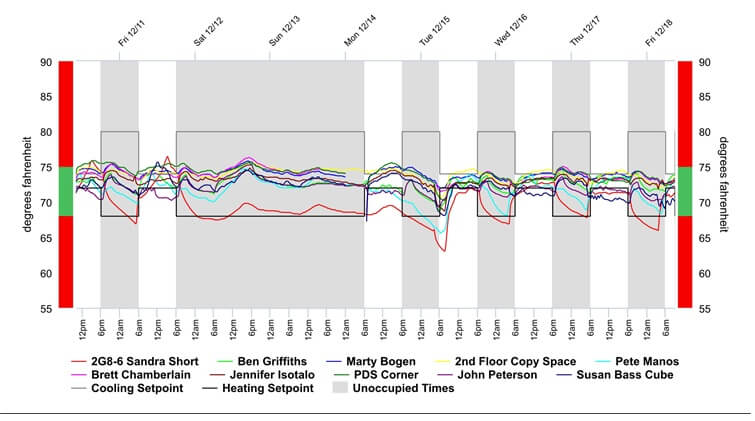 T.H. Eifert uses the Energy Savings Assessment (ESA) to graphically demonstrate sources of waste and discomfort with existing PM clients. By placing wireless sensors throughout the facility, T.H. Eifert can record the building’s actual performance when occupied and unoccupied. Typically, buildings have issues with occupants overriding controls, cleaning crews leaving lights on, and, due to over-engineering, too much fresh air being introduced on a 24/7 basis.