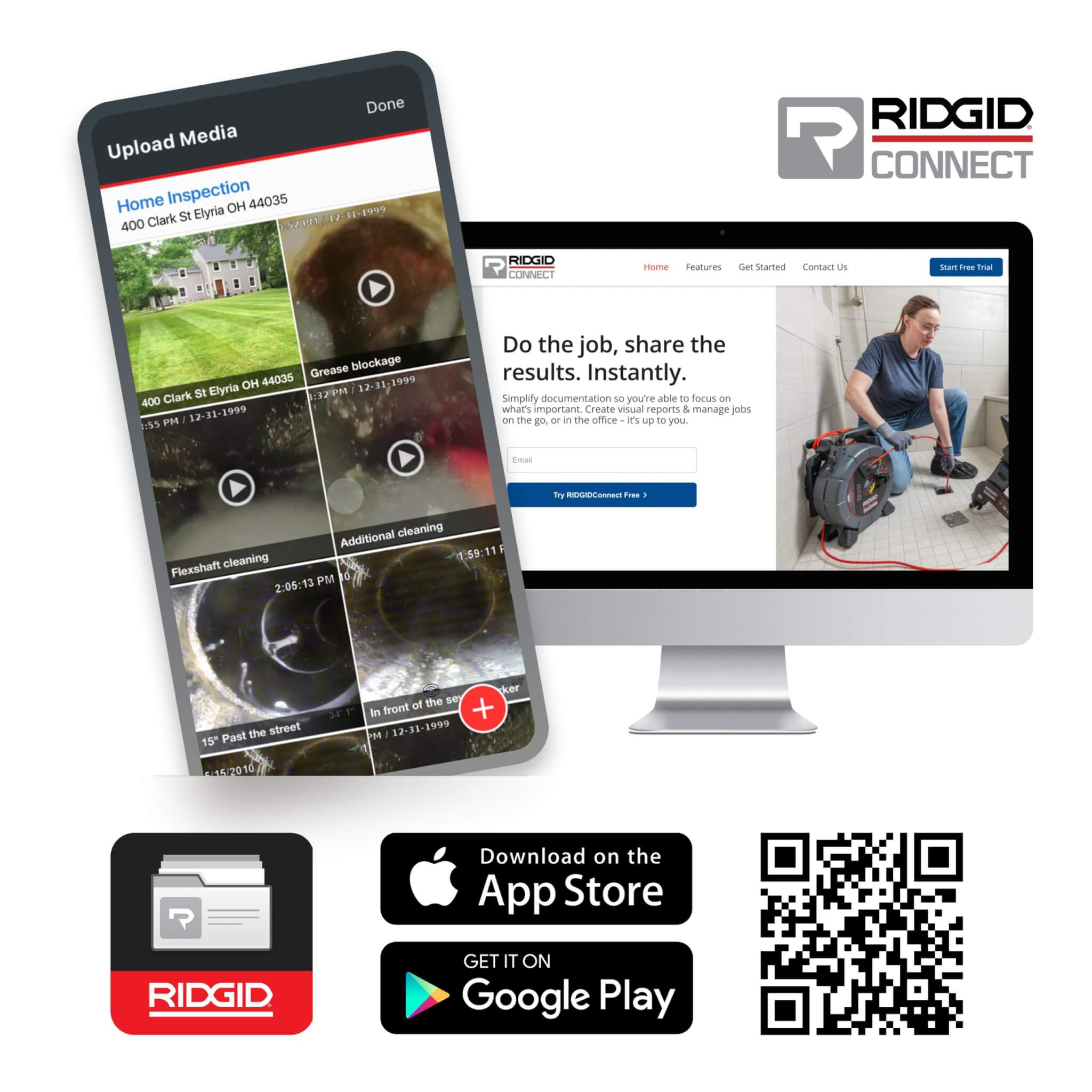 - Job reporting: Access detailed job data, such as video, images, maps, and graphs, that can be used in compatible reporting systems. Information can be shared via mobile device for on-the-go reporting, such as in-pipe findings, project completion details, and other key metrics. For example, RIDGIDConnect™ is an online tool designed for contractors and service providers to create and share reports with customers that include videos, documents, and pictures collected from jobsites.