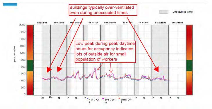 Using the BuildingAdvice platform, TCMS began to assess control issues in the facility. Having already collected schedule information, the wireless sensor arrays included with the BuildingAdvice system allowed TCMS to compare temperature, humidity, carbon dioxide, and light readings during occupied and unoccupied times for over one week. Using graphs to display how a facility’s systems actually operate, especially during unoccupied times, has a tremendous impact on owners and operators who have very little idea what happens when no one is there.