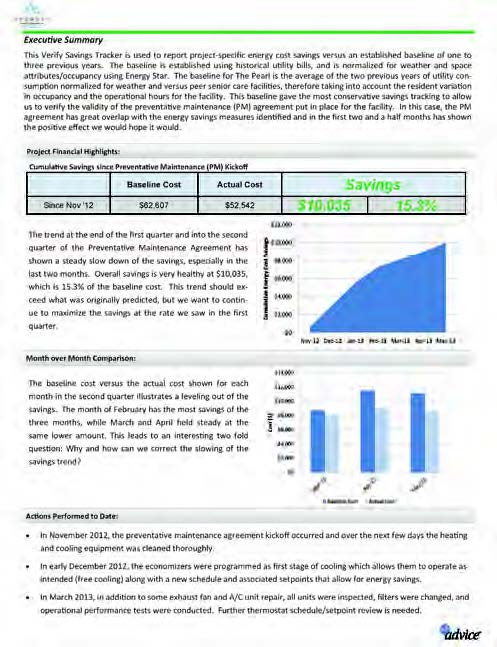 In less than three months, the PM yielded $5,562 in savings, almost 18-percent savings on utility bills compared with the prior two-year average. In just over six months the program generated over $10,000 in measurable savings. In fact, Avamere achieved a complete return on its investment in the initial PM program for the Pearl within seven months. “The power of definitively proving that our PM pays for itself in less than seven months is an absolute differentiator in our market,” said Moore. “We now use this SavingsTracker graph in all of our first meetings to drive this message home in our sales process.”
