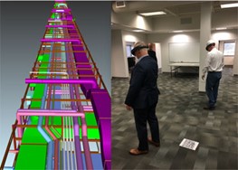The DfMA process helped the team visualize racks and corridors to reassure the owner that the strategy would meet the building’s lifecycle needs and aggressive schedule. Using “mixed reality,” a combination of physical and virtual information, the owner’s representatives were able to explore the racked systems to simulate the ease of installation and future maintenance. Mixed reality was also used for quality assurance and quality control of modules and allowed the owner to “walk through” virtual racks alongside the fabricated racks.