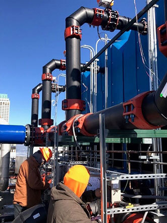 Once onsite, Shoemaker Mechanical had one weekend to move materials from the street to the roof of the seven-story building without bucket hoists, pulleys, or elevators. The team used a crane to lift parts into position, while crews easily maneuvered the lighter-weight piping into place by hand. Workers then joined the HDPE pipe with hand tools and visually verified correctly installed joints by ensuring bolt-pad-to-bolt-pad contact, giving them confidence in the system’s durability and longevity.