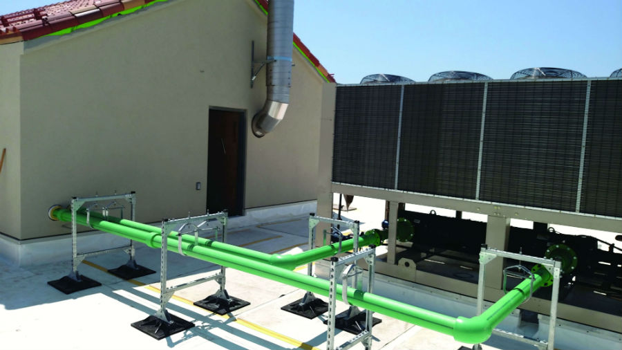 Because of their light weight compared with metal pipe, Aquatherm fabricated spools were carried manually to the roof without a mechanical assist. Tying Daikin air handling units and air-cooled scroll compressor chiller and Armstrong pumps together is Aquatherm SDR 7.4 Green Pipe® in 2″, 2 1/2″, 3″, and 4″ diameters.