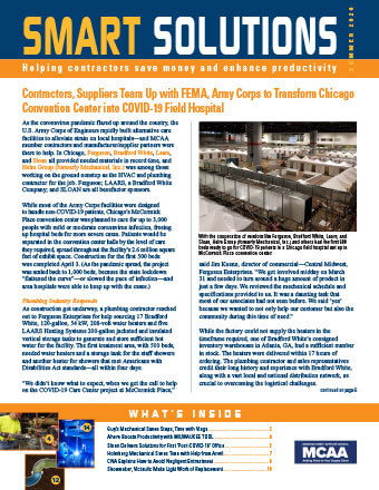 As the coronavirus pandemic flared up around the country, the U.S. Army Corps of Engineers rapidly built alternative care facilities to alleviate strain on local hospitals—and MCAA member contractors and manufacturer/supplier partners were there to help. In Chicago, Ferguson, Bradford White, Laars, and Sloan all provided needed materials in record time, and Helm Group (formerly Mechanical, Inc.) was among those working on the ground nonstop as the HVAC and plumbing contractor for the job. Ferguson; LAARS, a Bradford White Company; and SLOAN are all benefactor sponsors.