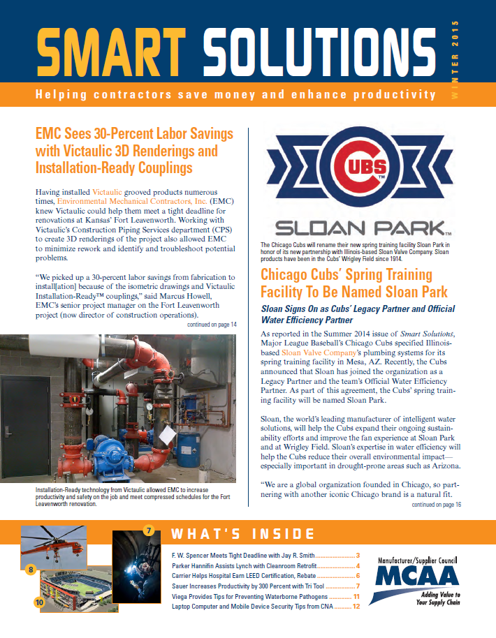 Having installed Victaulic grooved products numerous times, Environmental Mechanical Contractors, Inc. (EMC) knew Victaulic could help them meet a tight deadline for renovations at Kansas’ Fort Leavenworth. Working with Victaulic’s Construction Piping Services department (CPS) to create 3D renderings of the project also allowed EMC to minimize rework and identify and troubleshoot potential problems. “We picked up a 30-percent labor savings from fabrication to install[ation]” said Marcus Howell, EMC’s senior project manager on the Fort Leavenworth project (now director of construction operations).